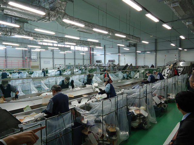 また、同工場に集まる何トンもの使用済みトレーやPETなどを材質や種類によって選別する仕分け作業を、障害者の方々を多数雇用し手作業で行っておられました。