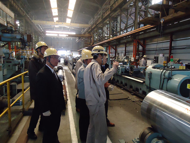 午後から見学した株式会社フジコー 山陽工場では、従来、廃棄処理されるのが普通だった使用済みの熱延ワークロールをCPC法という独自の技術により再成形し、溶接による軸部の形状復元で新たな圧延ロールとして生まれ変わらせる工程を、間近で見学させていただきました。