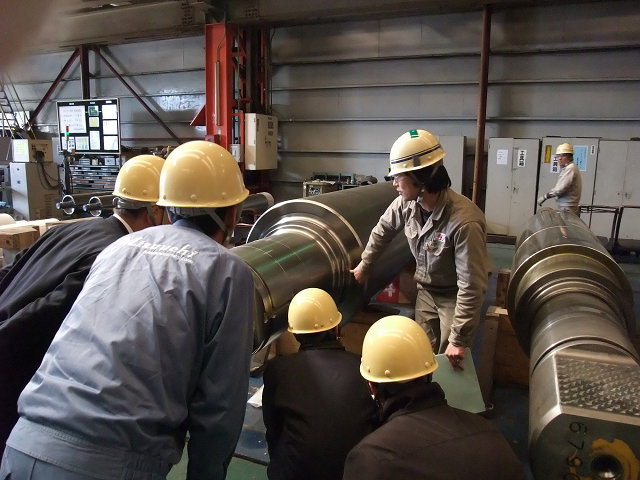 従来廃棄処理されていた使用済みの熱延ワークロールが溶接による軸部の形状復元で新たな圧延ロールとして生まれ変わる姿に、一同、感嘆!!